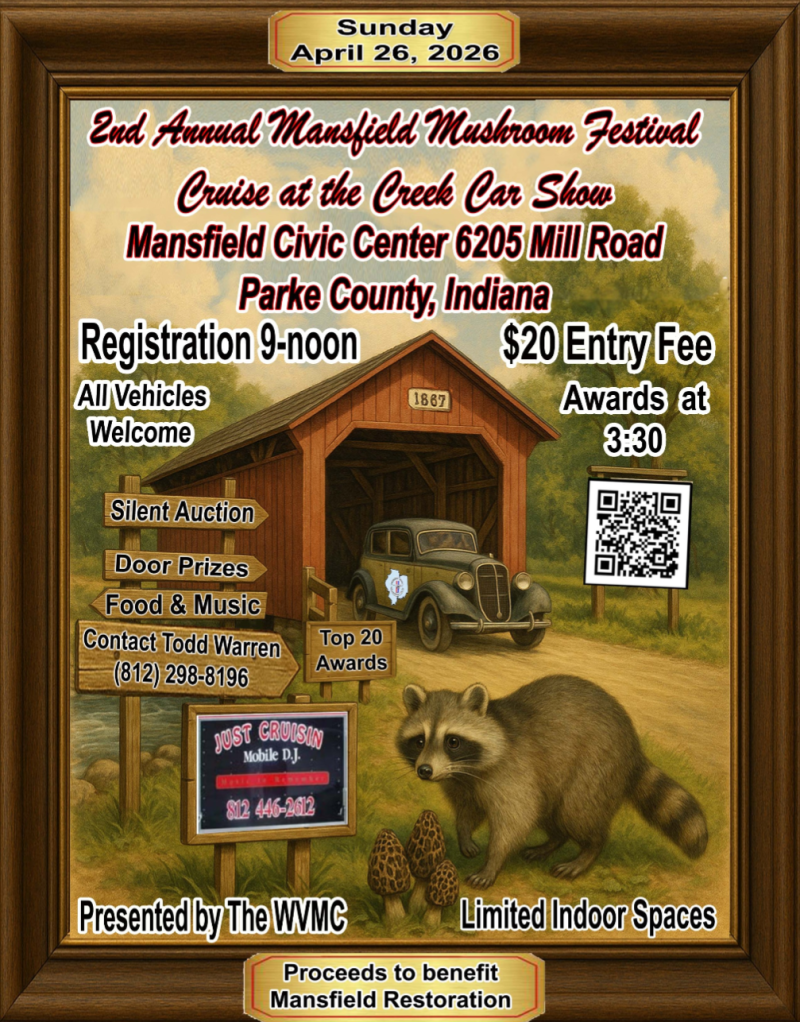 I would like to invite your car club to our 2nd Annual Cruise at the Creek Car Show on Sunday April 26, 2026. The show will be held at Mansfield Civic Center. The address for the Civic Center is 6205 Mill Rd, Rockville, IN 47872. All makes, models & motorcycles are welcome. This is our 2nd annual show. The show is rain or shine. In case of rain there is limited indoor parking inside the Civic Center. Registration is from 9-12 with top 20 awards at 3:30. Registration is $20 and the proceeds will benefit Mansfield Restoration. There will be a silent auction, door prizes, food, music and much more.